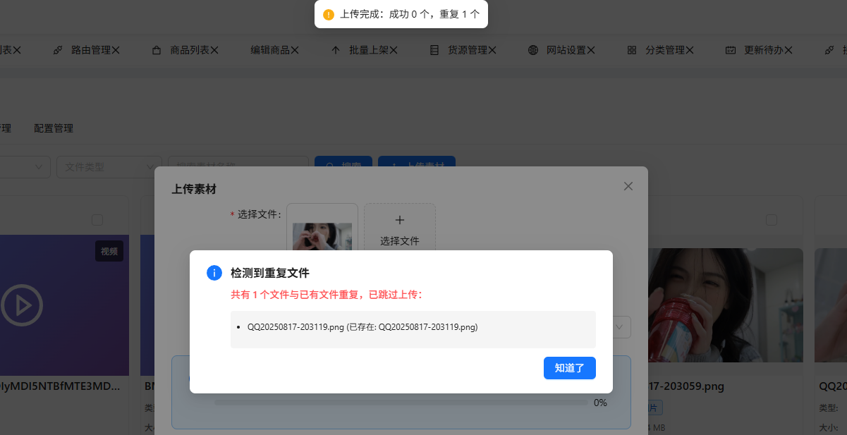 素材库上传文件使用 md5 验证文件的唯一性,重复的话会弹窗告诉你有哪些重复的
