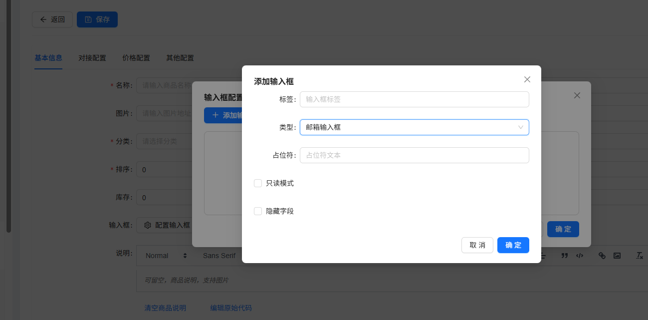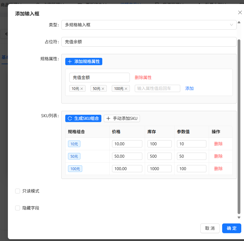 添加一个商品,在这里加一个多规格输入框,因为要让用户选择充值金额