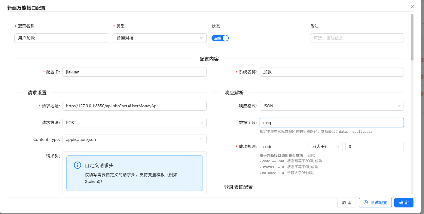 万能接口这个有点复杂配置起来,你得有一点网络基础,和开发思维!