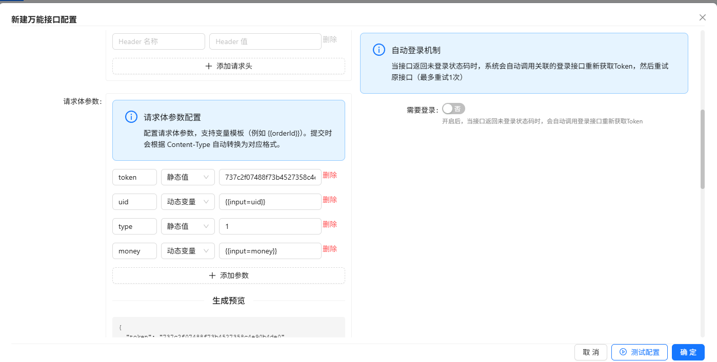 下面是万能接口的配置(content-type 要选择application/x-www-form-urlencoded,作者这里选错了)